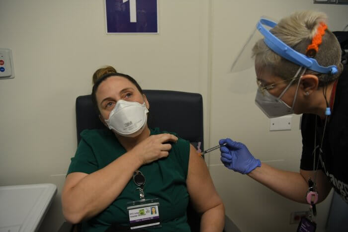 Yesterday, two workers at Queens’ Elmhurst Hospital, Veronica Delgado, lead physician’s assistant in the hospital’s emergency room and William Kelly, a service aid in the environmental service department, became the first public hospital staffers in the city to receive the vaccine.
