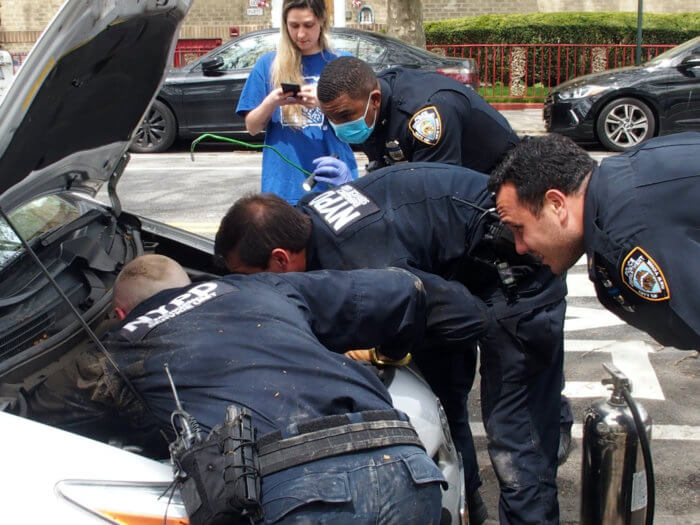 Officers from the 61st Precinct and Emergency Service personnel responded and at first tried to remove the kitten from underneath the car without success. After finding the owner of the car, authorities were able to dig into the engine compartment where they worked for some time trying to free the kitten.