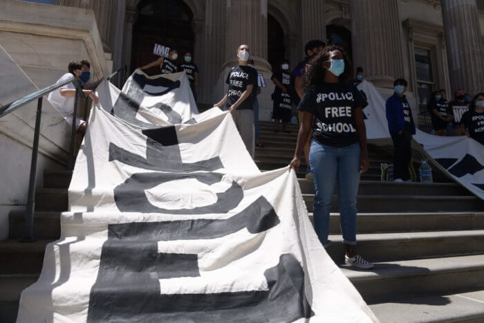 The rally was organized by the Urban Youth Collaborative, a youth advocacy organization that’s calling for the remove of police from schools and the reallocation of NYPD funds for school mental health services, social services, student recreation, and education.
