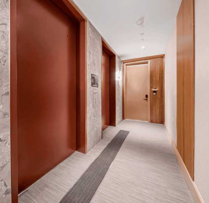 Renderings show the apartments have floor-to-ceiling windows, white finishes, and light wood floors and cabinetry. Stores will fill the ground level, according to permits. Most of the building’s facade is taken up with balconies and large windows set between grooved orange panels, creating strong vertical and horizontal lines with a bit of a Deco feel. The lowest two levels are covered in dark gray squares and the uppermost stories are clad in pale gray grooved paneling.