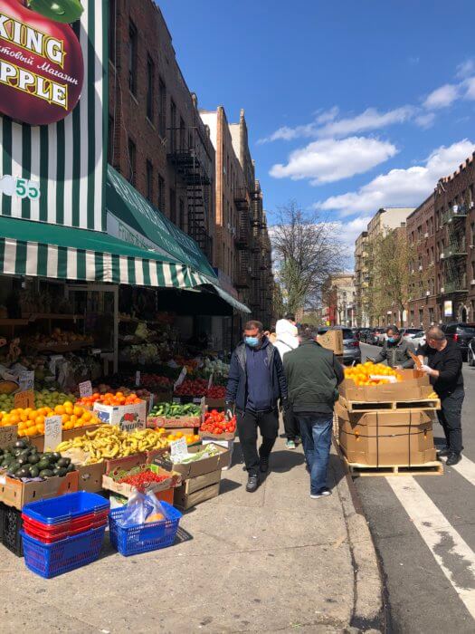 The fruit stand employees, who Singer says were slow to adorn masks and gloves, have begun taking up so much space on the sidewalks that it is impossible to walk without coming troublingly close to other pedestrians.