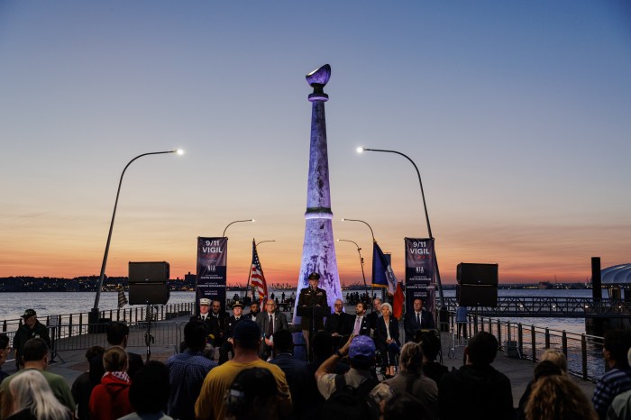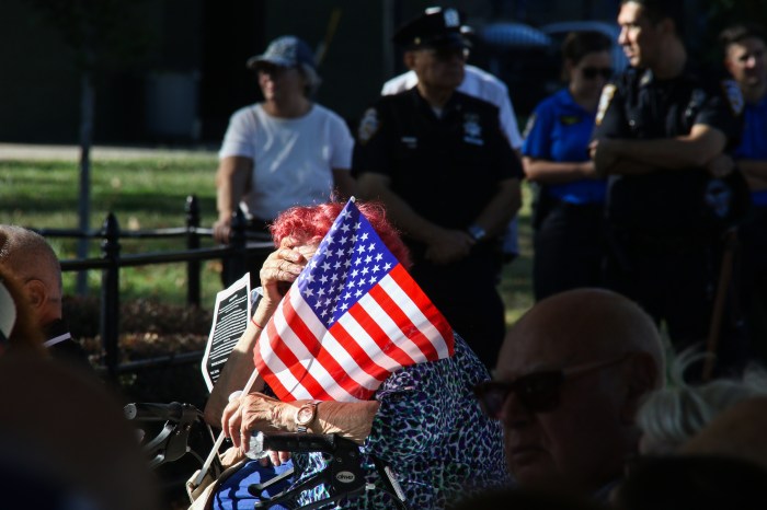 Over 100 people gathered at the American Veterans Memorial Pier in Bay Ridge on Wednesday to remember the victims of the attacks. Law enforcement officials, servicemembers, and elected leaders spoke to the crowd, which waved American flags and solemnly gazed across the Manhattan skyline, with the beaming tower lights in view.