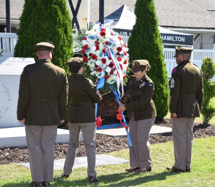 The ceremony featured a 21-gun salute and the playing of taps. A wreath was placed at the garrison’s 9/11 memorial by Col. Cantwell, Garrison Command Sgt. Maj. Christopher Hill, U.S. Army Reserve Maj. Gen. Kris A. Belanger, commanding general of the 99th Readiness Division, and CSM Corey A. Thompson, also of the 99th Readiness Division.