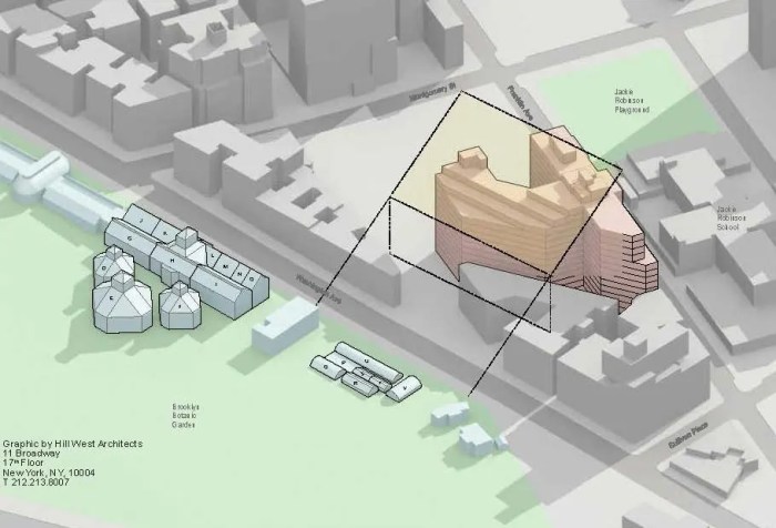 The 14-story tower at 962-972 Franklin Avenue will now feature a reduced 10-degree slope, down from the initially proposed 15 degrees, to protect the garden’s vulnerable plants — a change the garden staff requested during the rezoning application process.
