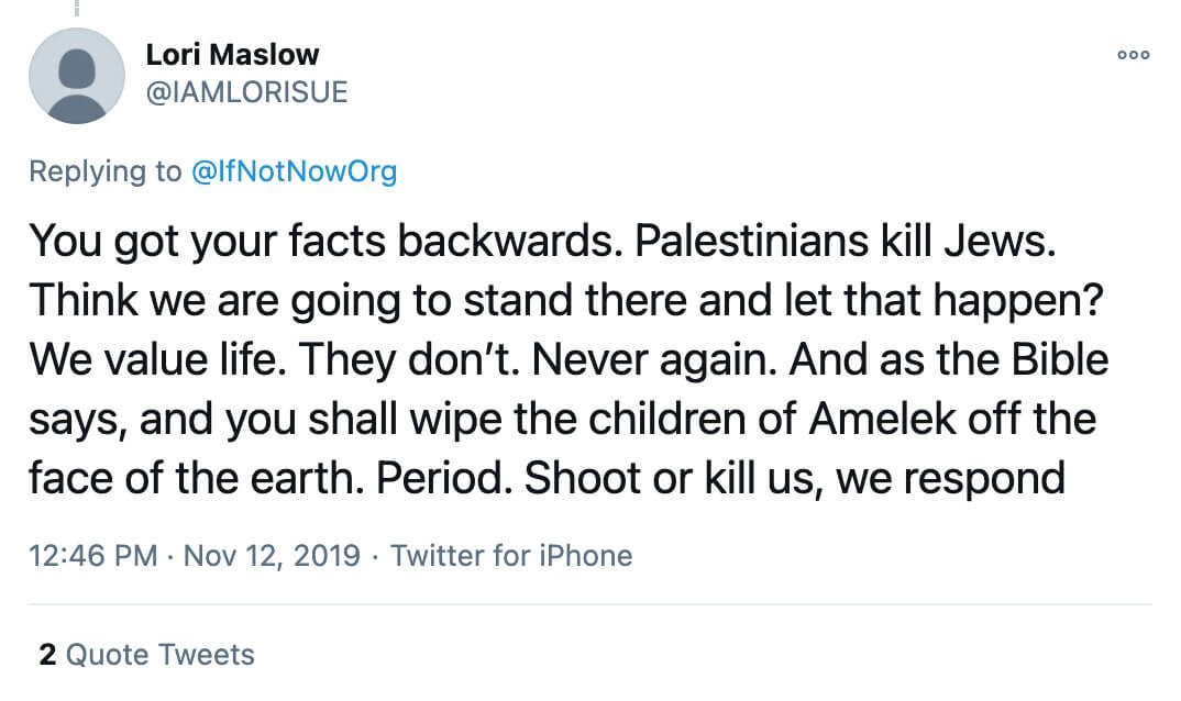 In a Nov. 12, 2019, tweet Maslow cited the Bible implying that Palestinians would be wiped “off the face of the earth,” in response to a tweet by the group If Not Now, which opposes Israeli occupation of Palestinian territories.