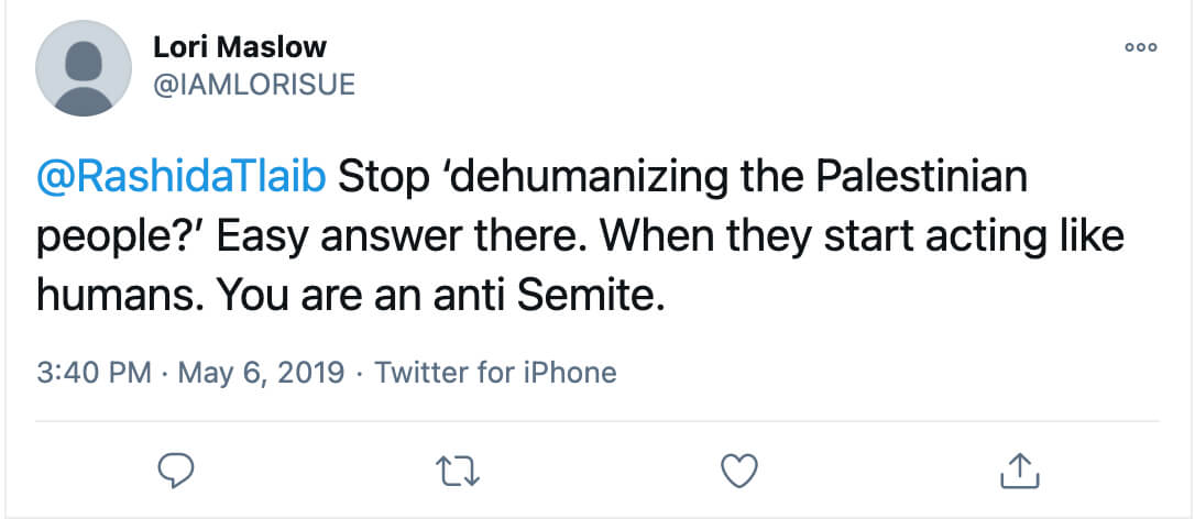 Earlier that year on May 6, Maslow tweeted at Rep. Tlaib: “Stop ‘dehumanizing the Palestinian people?’ Easy answer there. When they start acting like humans. You are an anti Semite.”