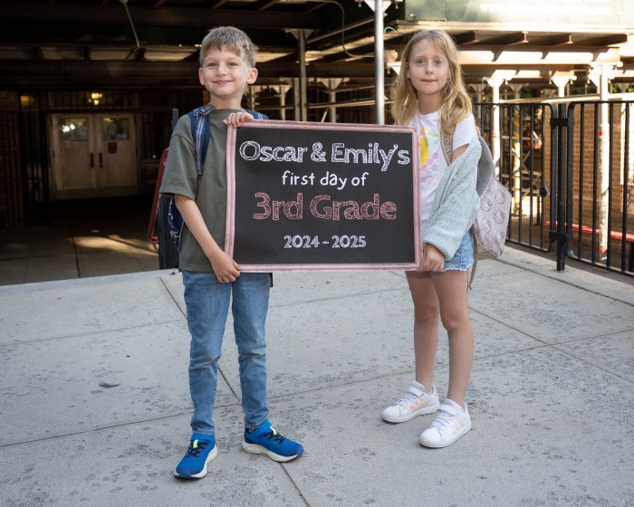 Twins Oscar and Emily posed for a family photo outside P.S. 321’s main entrance, holding a sign that read “Oscar & Emily’s First Day of Third Grade.”
