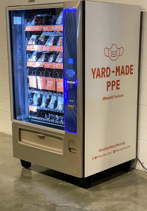 The machines currently sell face masks produced by Yard tenants Accurate Knitting, American Heirloom, Atoms, Crye Precision, Engraved Signs, Fydelity, Rebel Designs, Stitch NYC and Tracey Tanner. The hand sanitizer is produced by Kings County Distillery, EcoLogic Solutions, and Scully’s.