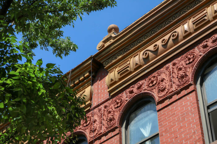 Next to the Queen Annes sit eight midblock brick and brownstone row houses designed in the Neo-Grec style by architect Edward F. Gaylor and built in 1885. Hurley said the houses all have all typical Neo-Grec details such as incised shoulder lintels, bracketed sills, door hoods and cornices. Further down the block, still on the west side, sit three brownstone row houses with Renaissance-Revival details built by Benjamin Finksieper in 1901.