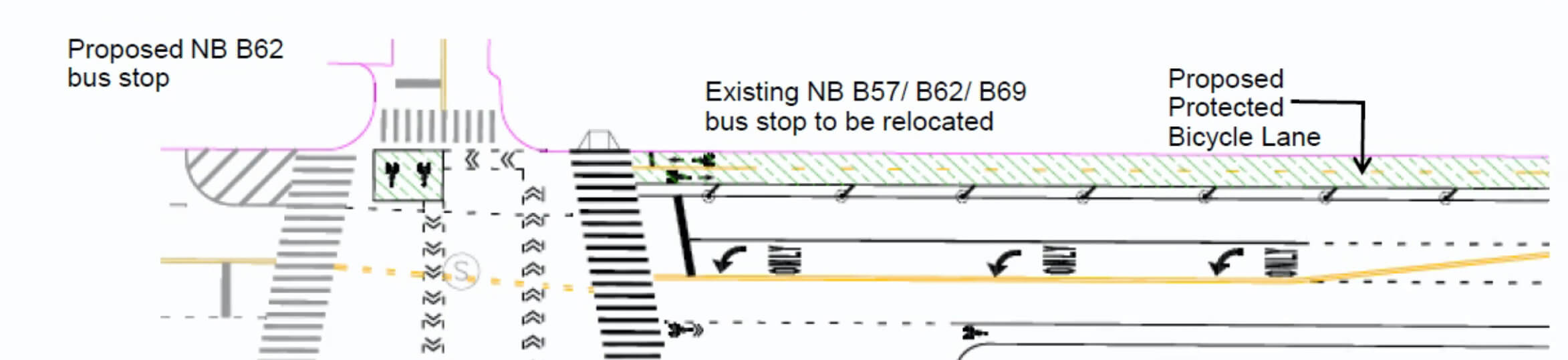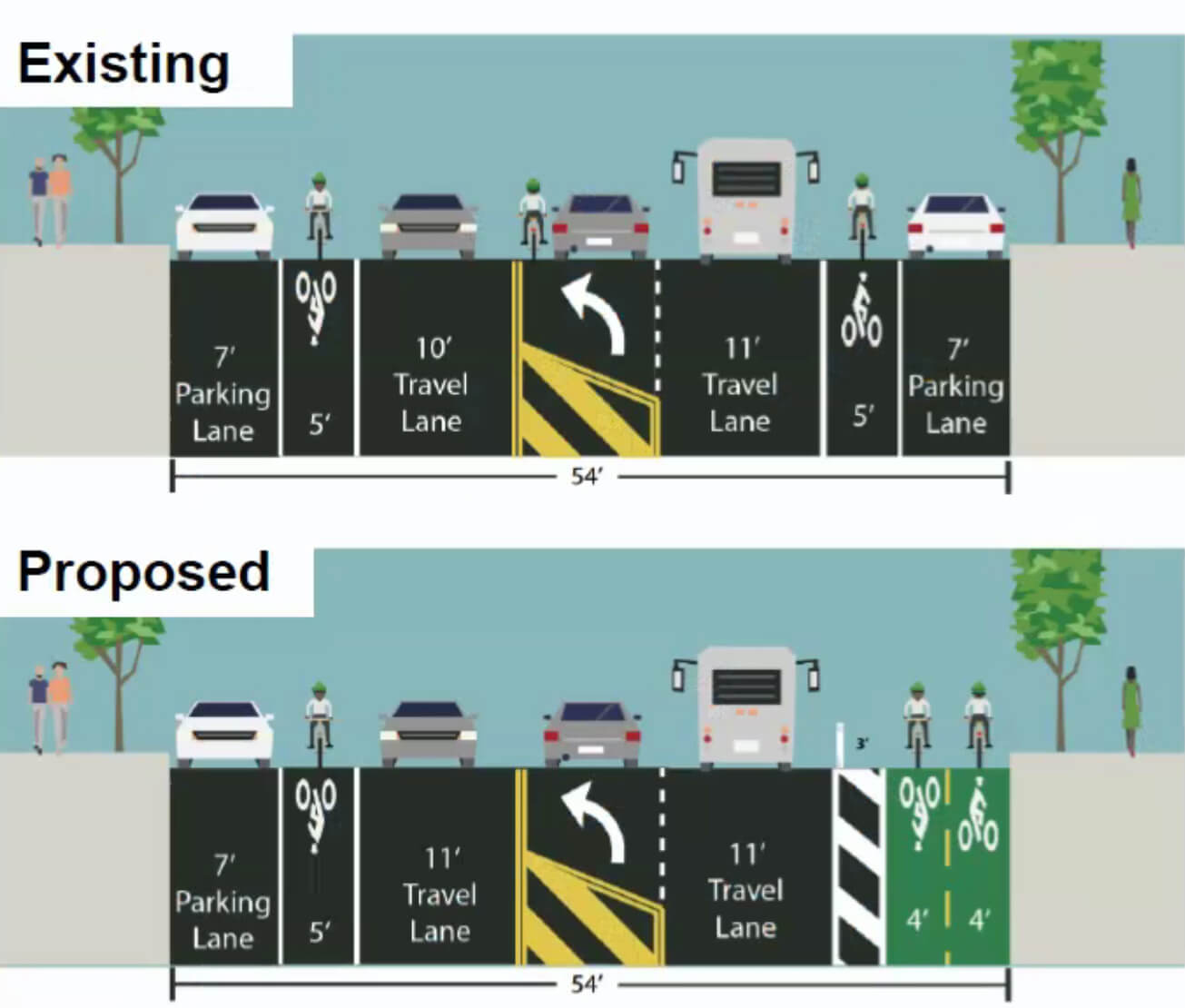 Like the remainder of that lane, the new northern addition will have a bike lane protected by a painted buffer and parked cars.