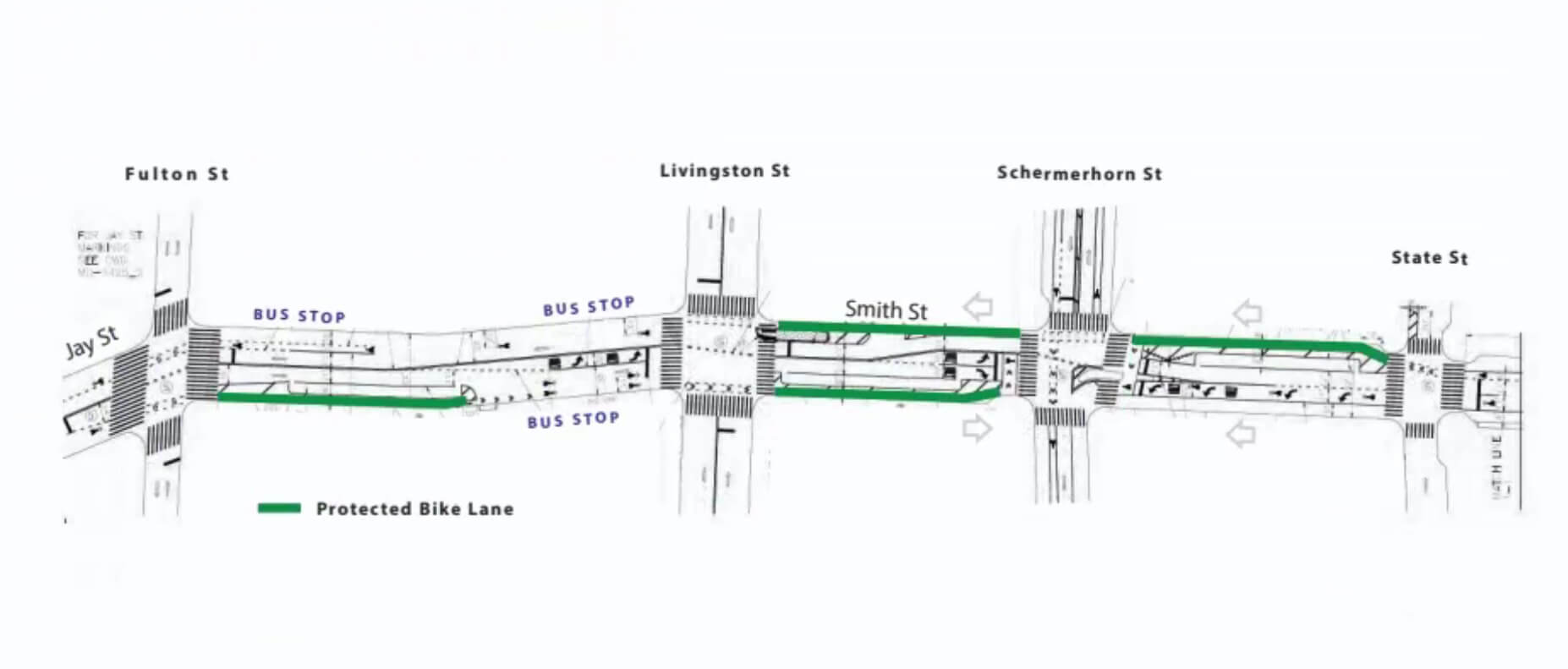 The agency plans to roll out the new lanes on Smith Street between State and Fulton streets, replacing the temporary plastic bollards officials put there in March to accommodate the surge in bike traffic during the COVID-19 pandemic.