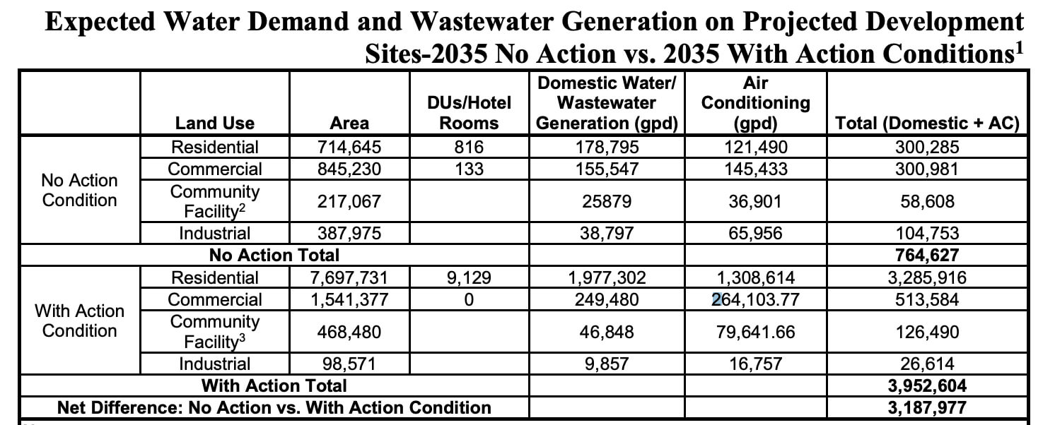 By the most recent city estimates from a 2019 scoping document, officials project the rezoning will lead to a more than tenfold increase in residential wastewater generation, from 178,795 gallons per day to almost two million.