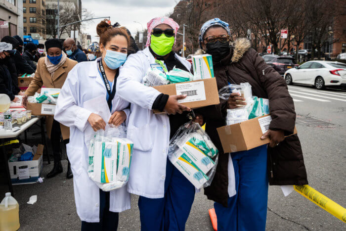 A steady stream of Kings County Hospital and University Hospital of Brooklyn employees braved the cold winds on Jan. 27 by standing in line to pick up free PPE donated by Cut Red Tape 4 Heroes.