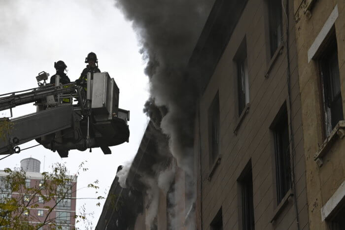 A group of firefighters became briefly trapped within the building but were quickly removed, according to the department. Four firefighters were injured, including one who suffered a neck injury. No civilians were injured, but one resident of the building was displaced from their home.