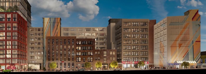 To build the new 21-story building that will front Flushing Avenue and run from Hall to Ryerson street, the developers will demolish the five-story Romanesque Revival brick building at 248-252 Flushing Avenue, on the corner of Flushing Avenue and Ryerson Street. It was designed by Theobald Engelhardt for the B.A. Jurgens grocery warehouse and built in the 1890s. They also plan to demolish a noncontributing single-story brick building at the southeast corner of Flushing Avenue and Hall Street.