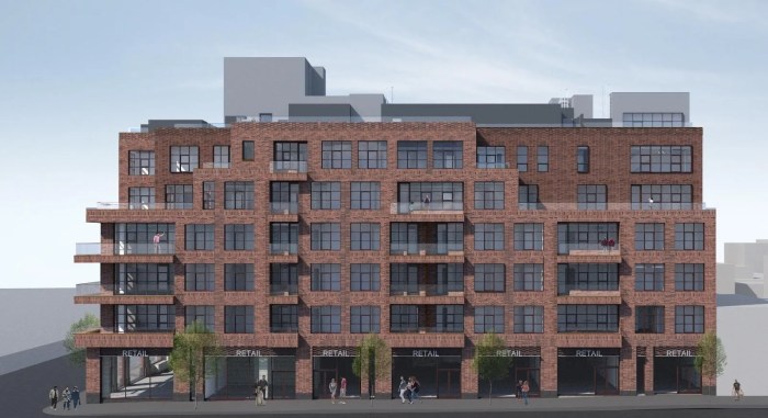 Renderings show the planned corner building, which will stretch down North 6th Street, will resemble one of the early 20th century factories in the area with a red brick facade and multi-paned industrial style steel windows. Some apartments will have balconies with glass railings. The building has setbacks starting on the fourth floor, creating terraces for some apartments.