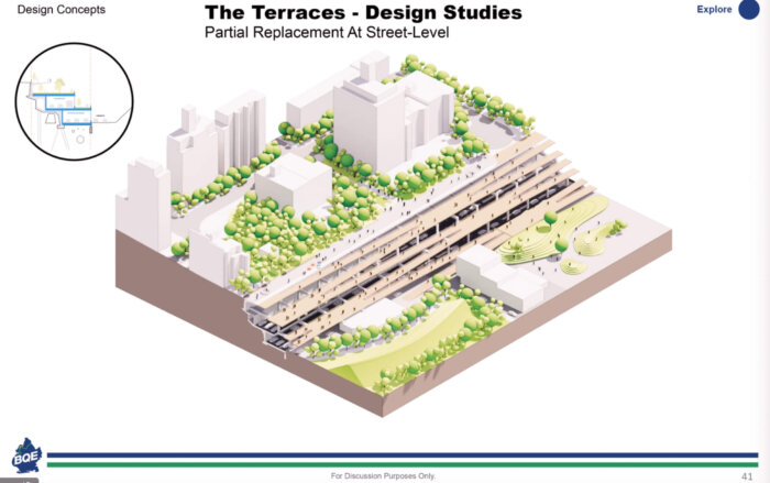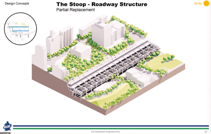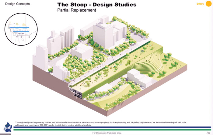 The Triple Cantilever Joint Venture, working as the consultant for design and construction, shared three new structural concepts that were each paired with variations of green space designs. The three structural variations have been dubbed The Terrace, The Landing and The Stoop. All three would have at least three lanes in each direction, according to the mockups.