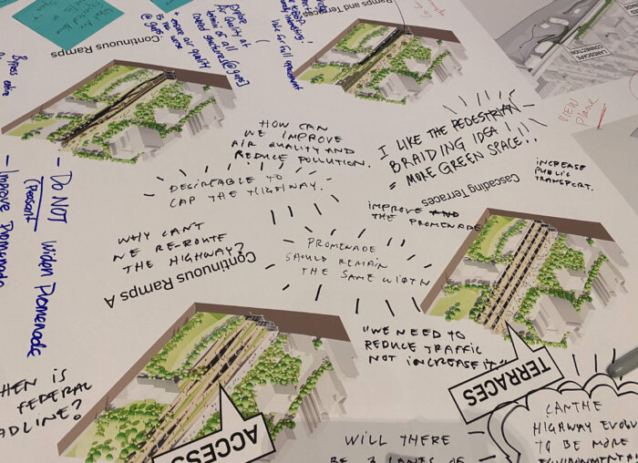 Despite colorful illustrations showing creative plans for increasing public green space over and around the divisive highway, not everyone was impressed. Many took issue with the city’s plan to widen the roadway and add lanes, a condition of receiving federal highway funds. While the roadway will contain at least two lanes of traffic, as it does now, a required third lane in each direction could be used as a shoulder, HOV lane, for electric vehicles or possibly rapid transit buses, DOT Chief Strategy Officer Julie Bero said.