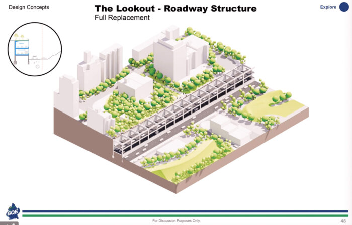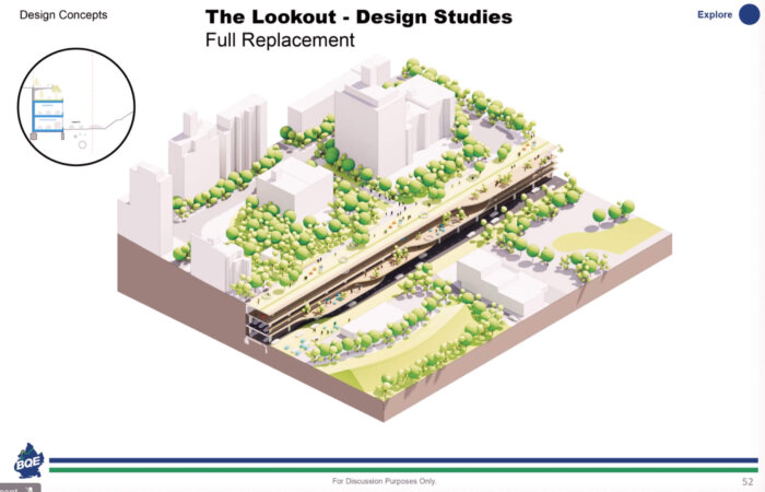 The second concept presented is the Lookout, which, given the full replacement of the currently terraced retaining walls, creates additional space underneath the Promenade with the north and south lanes stacked directly on top of each other. The Lookout would allow for significant open space above the roadway at the level of the Promenade, Vega-Barachowitz said, and the full replacement will minimize the overall visual impact of the roadway by locating it under an enlarged or reimagined Promenade.