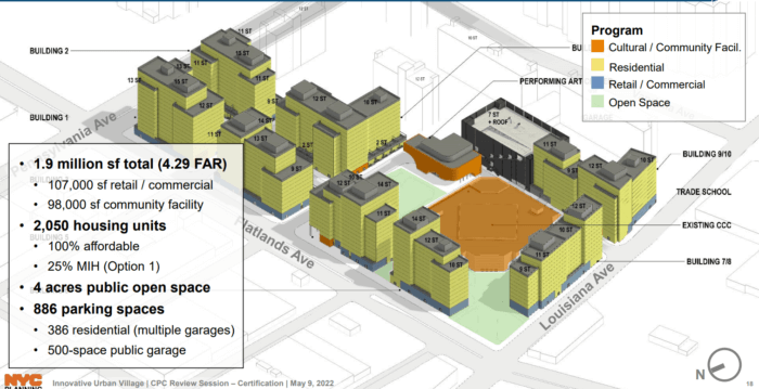 The urban village would see 1.7 million square feet of new development in eleven buildings on the CCC’s 10.5 acre parcel at the northwestern tip of Starrett City, which adjoins the megachurch that, with 32,000 members, is one of the largest Christian parishes in the city. Developers hope to build 2,050 apartments, ground-floor retail including a grocery store, greenspace, a trade school, a performing arts center, and a daycare, along with 900 parking spots.