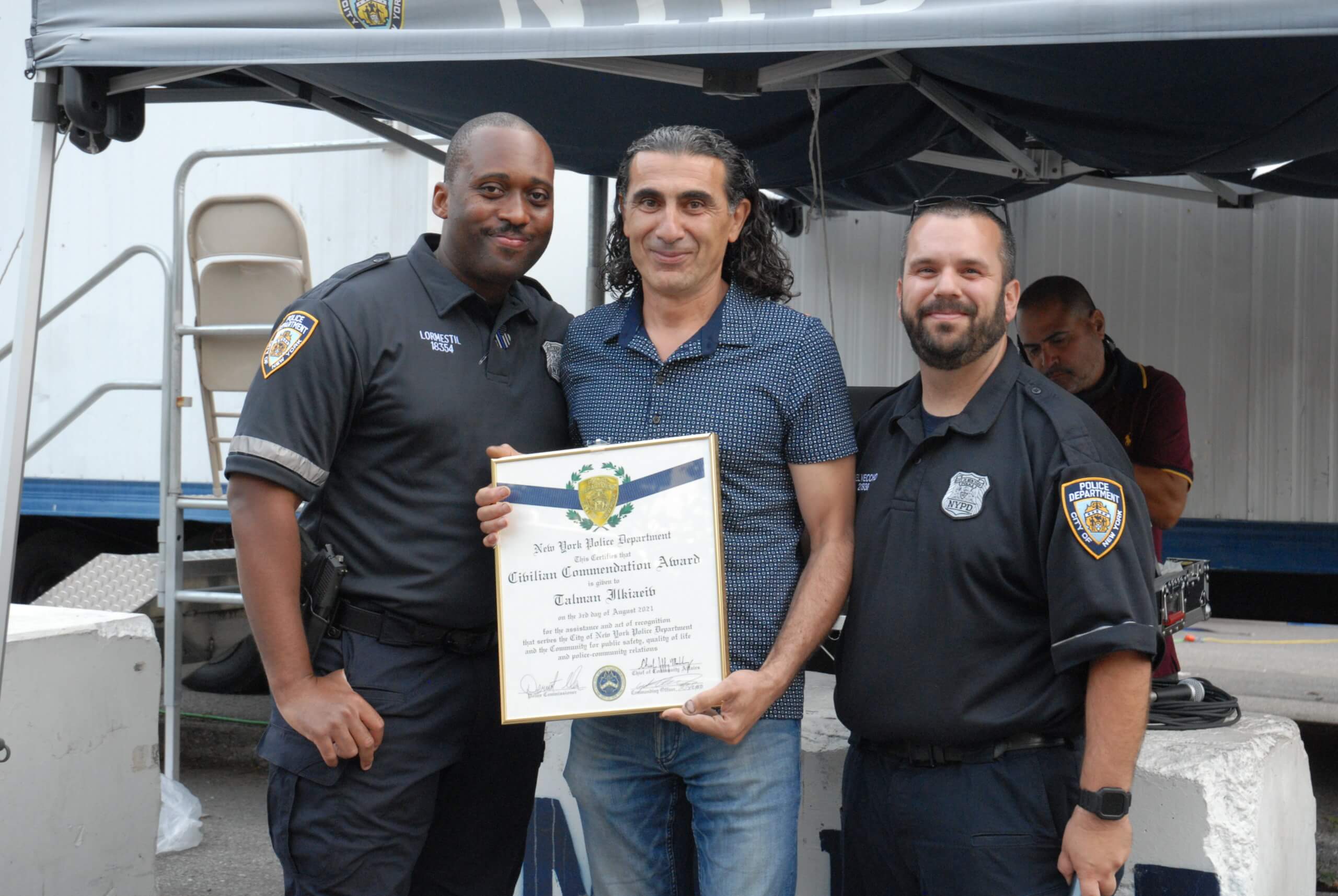 The 60th Precinct in Coney Island hosted their gathering outside their West 8th Street stationhouse, where they awarded local businessman Talman Elkiaeb was awarded a Civilian Commendation Award for his help servicing police vehicles at his auto body shop.