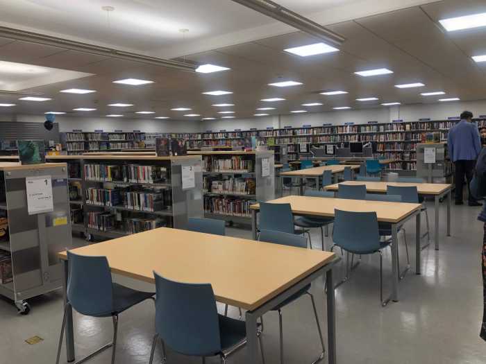 The new branch is 26,620 square feet, larger than almost all of BPL’s other neighborhood branches, according to the library. Only the Central Branch on Grand Army Plaza is larger. It includes on the basement level a dedicated area for children — outfitted with a stroller car park and cork walls for soundproofing — along with a large multi-use community room with a kitchenette and stage and seating for up to 225 people.