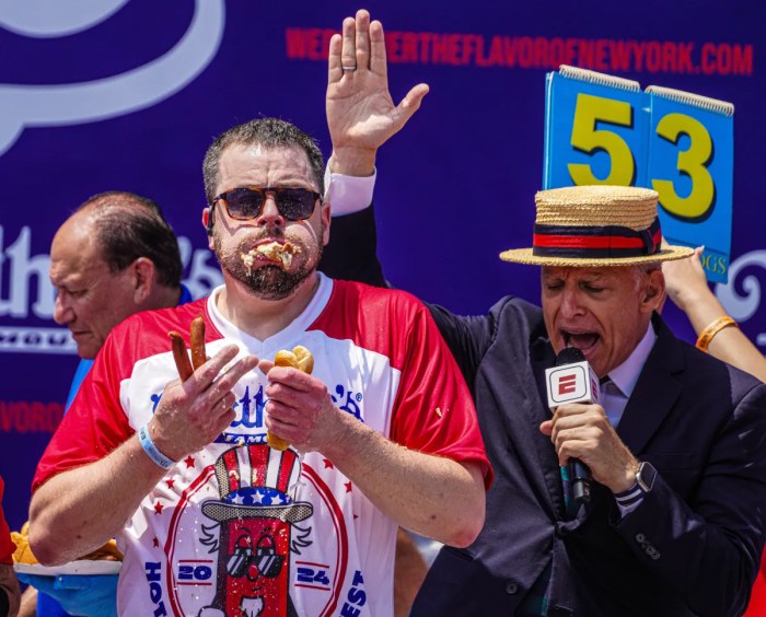 In a dramatic turn of events at this year’s Nathan’s Famous Hot Dog Eating Contest, Patrick Bertoletti emerged victorious, devouring 58 hot dogs to claim the championship title after longtime victor Joey Chestnut was barred from the competition after inking an endorsement deal with vegan food giant Impossible Foods.