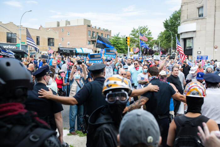 At the start of the march, a group of about a dozen counter-protesters met at the corner of 13th Avenue and Bay Ridge Parkway in support of the Black Lives Matter movement. While many marchers ignored counter-protesters, one eyewitness said, a large group of pro-police attendees hung back and cursed at them, called them names, and mocked them for wearing face masks. That account has been verified by more than one viral video.