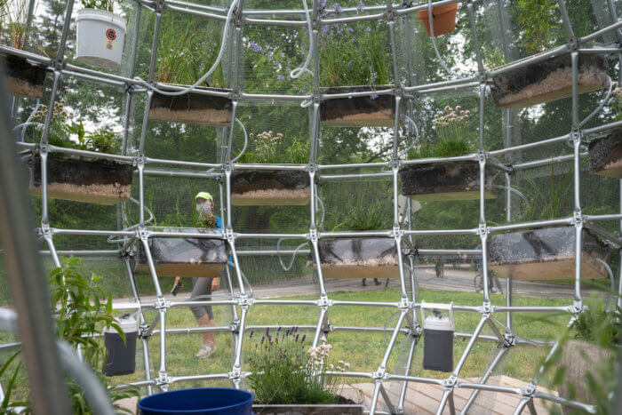 “Public Water” — presented by public art nonprofit More Art in conjunction with Prospect Park Alliance, New York City Department of Parks and Recreation and the Brooklyn Public Library — consists of a 10-foot tall geodesic dome that is filled with native plants that filter water in ways that mimic the city’s watershed (a version of the sculpture was first presented at the Brooklyn Public Library in early 2020).