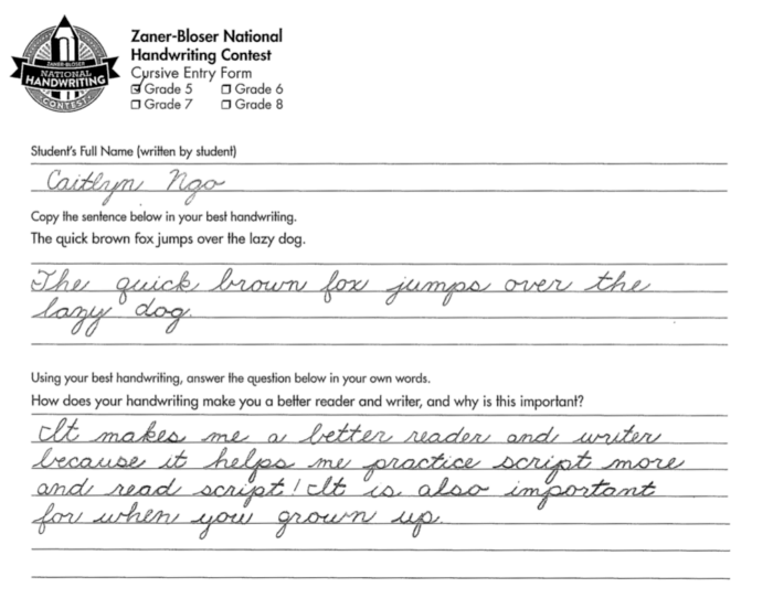 As a Grand National Champion, Ngo was recognized for having the best cursive handwriting among all fifth grade entries from across the US and received an engraved trophy and a $500 check. Ngo’s school received a $1,000 Zaner-Bloser product voucher and a certificate of achievement, while her teachers received a handcrafted, personalized certificate.