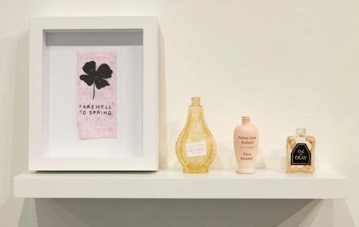 In hanging the work in the third-floor gallery space, the artists found common narratives and a bit of humor. A tableau of fast food includes French fry and chicken nugget wrappers screen printed by Jerinic paired with a 1950s Pepsi bottle brought back to life by Mainenti. Their work is paired throughout much of the space, with glass bottles presented on shelves and plinths and the screen prints hung in pristine white frames.