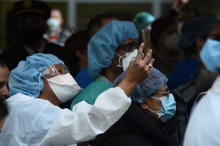 Doctors and nurses at Coney Island Hospital got a much needed boost on Thursday night from Mayor Bill de Blasio, First Lady Chirlane McCray and a large contingent of first responders during the nightly 7 pm cheer for workers on the front lines of the coronavirus pandemic.