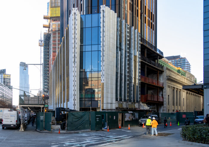 On Tuesday, workers at 9 Dekalb Ave. were busy in the still-under construction section of the base fronting Fleet Street, while the stretch along Flatbush Avenue Extension and Dekalb appears finished. The wavy white marble and dark stone-faced podium fuses the tower to the landmarked Dime Savings Bank.