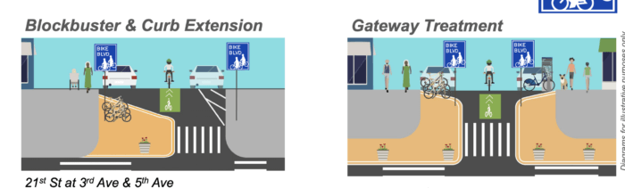 Also, on the same area of 21st Street, the department will install curb extensions at four intersections, which will force drivers to make slower turns onto the street. Third and Fifth avenues will see one sidewalk extended further into the crosswalk, while Fourth and Seventh avenues will see symmetrical extension jutting into the crosswalk from either side.