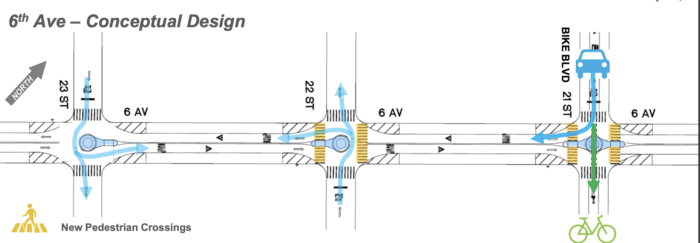 The proposal would also construct roundabouts on Sixth Avenue at the intersections of 21st, 22nd, and 23rd streets that will slow traffic when entering the bike boulevard between Sixth and Seventh avenues.