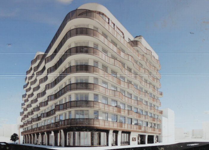The structure had reached six stories and dozens of workers were on site at 828 Metropolitan Avenue when Brooklyn Paper’s sister publication Brownstoner passed by last week. The concrete construction curves around the corner of the two major arterial avenues and, starting on the first floor, is wrapped in balconies whose wavy floors create a rippled effect across the building’s facade.