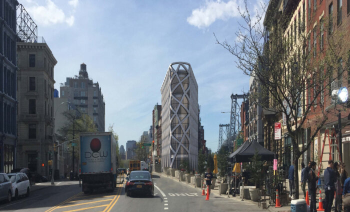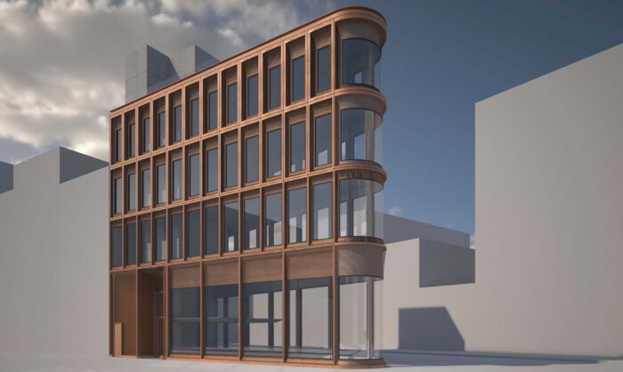 Conceptual renderings show an interesting structure that resembles a loosely woven net wrapping a glass building. The design emphasizes the rounded prow of the four-story building. Other concepts include a striking copper-colored metal, wood, and glass building with a resemblance to a Beaux-Arts greenhouse, as well as a one-story store with a four-story-high billboard.